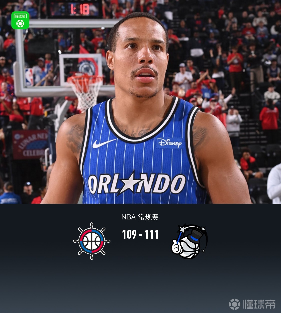 第四节快船伦纳德拿下5分,魔术贝恩拿下11分,最终快船109-111不敌魔术