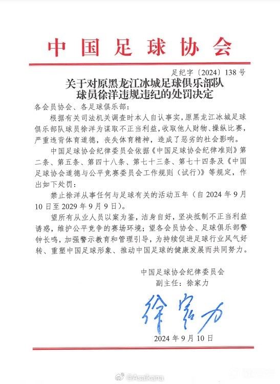 第一批禁足名单中,徐洋因2021-2022在黑龙江冰城效力期间的问题被禁赛五年。如今第二批因2016-2018年间在重庆力帆效力期间的问题被终身禁赛。