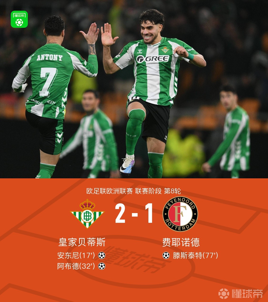 北京时间1月30日欧足联欧洲联赛 联赛阶段 第8轮,皇家贝蒂斯对阵费耶诺德。上半场,安东尼率先破门。随后,安东尼助攻,阿布德建功。下半场,滕斯泰特吊射扳回一城。全场比赛结束,贝蒂斯2-1击败费耶诺德,以第5名的成绩成功晋级。