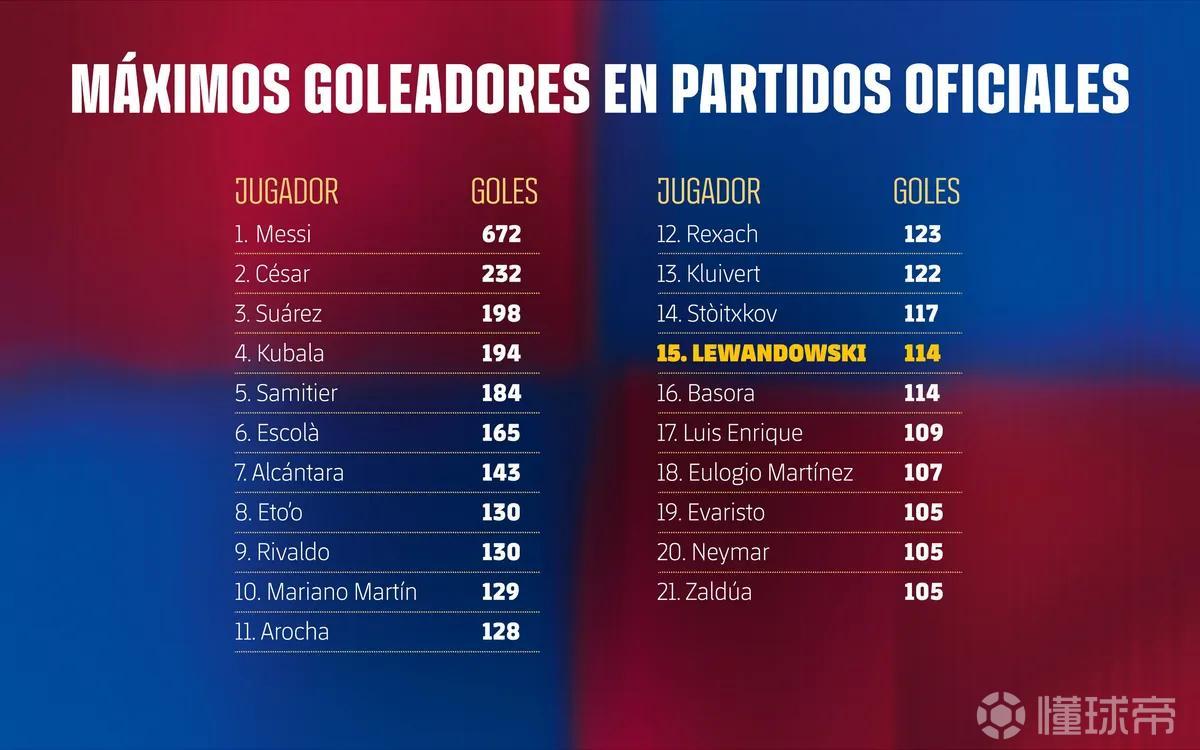 在与马略卡的西甲第23轮比赛中打入一球后,莱万巴萨生涯已打入114球,据巴萨官方统计,莱万升至队史射手榜第15位。