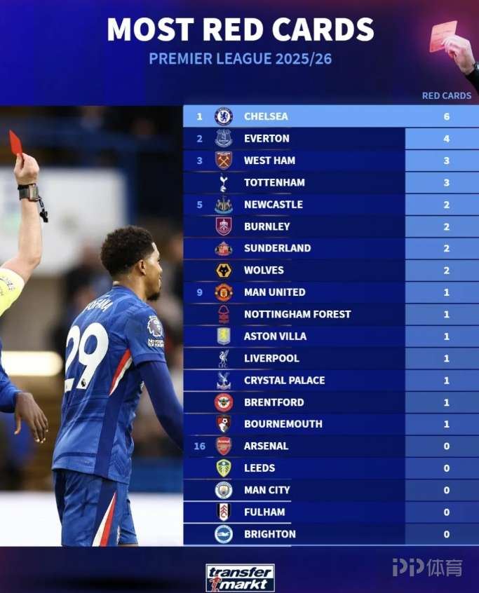 英超第27轮,切尔西1-1战平伯恩利,福法纳被红牌罚下。这是切尔西这赛季获得的第6张红牌,比第二名的埃弗顿多出两张。
