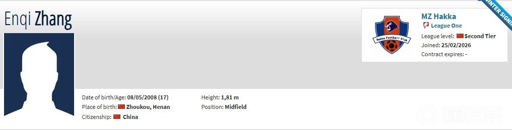 张恩祈现年17岁,司职中场,此前效力于中冠五华华京。