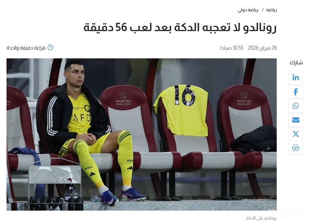 据阿联酋媒体alkhaleej报道,在C罗被换下后,他脸上不满的情绪清晰可见。