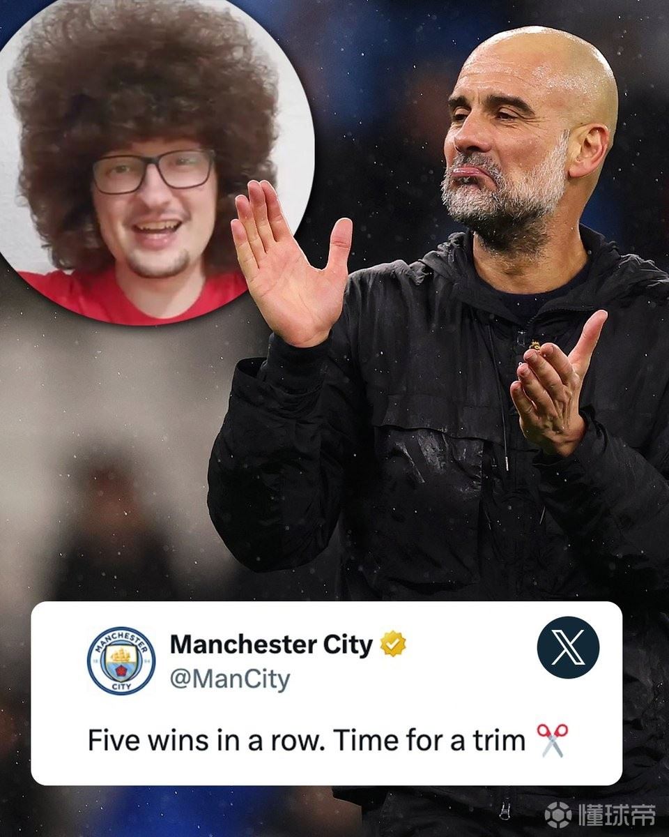 • 调侃曼联球迷蓄发哥,曼城官方:五连胜,是时候修剪一下了