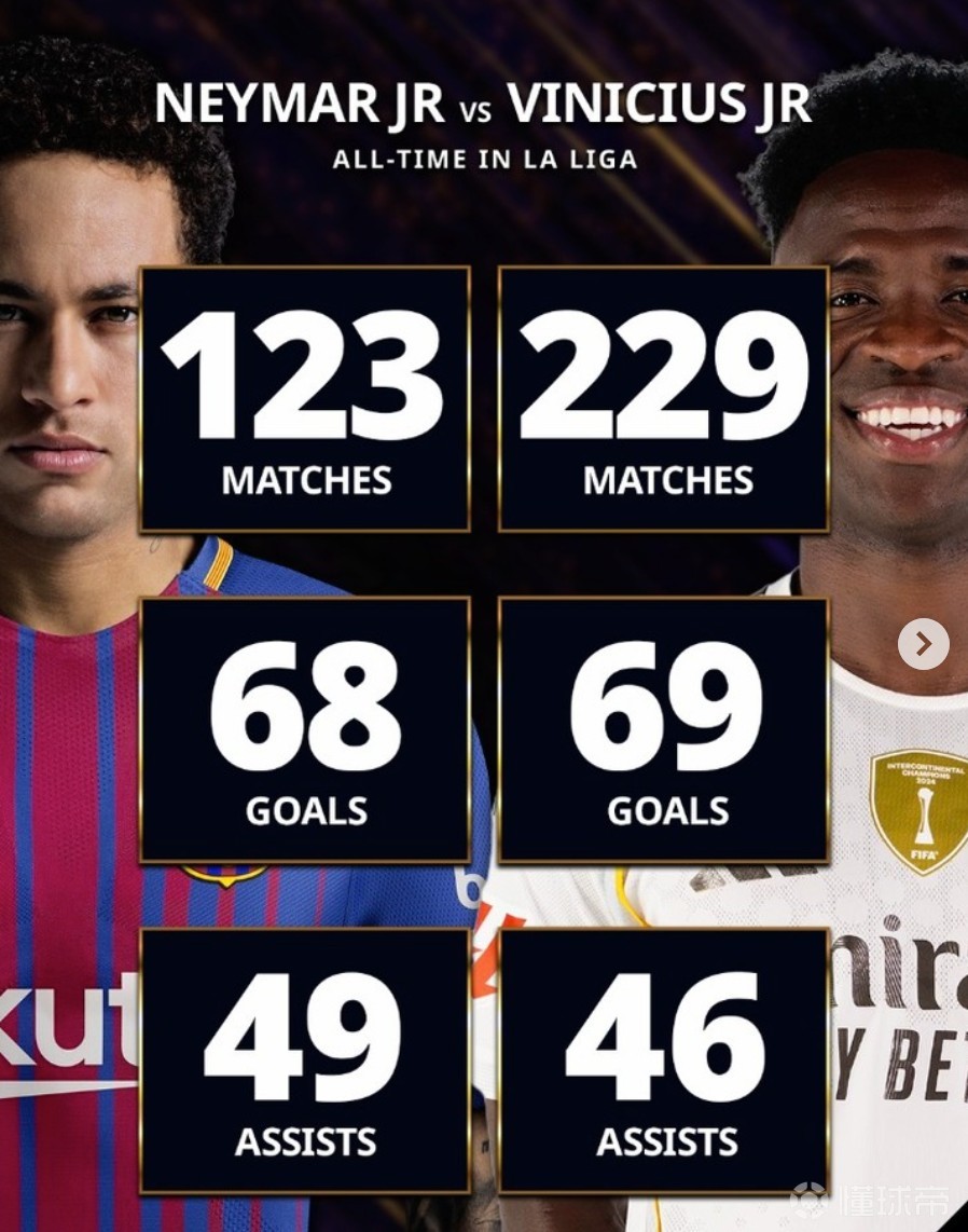 • 巴西天才西甲数据对比:内马尔123场68球49助,维尼修斯229场69球46助