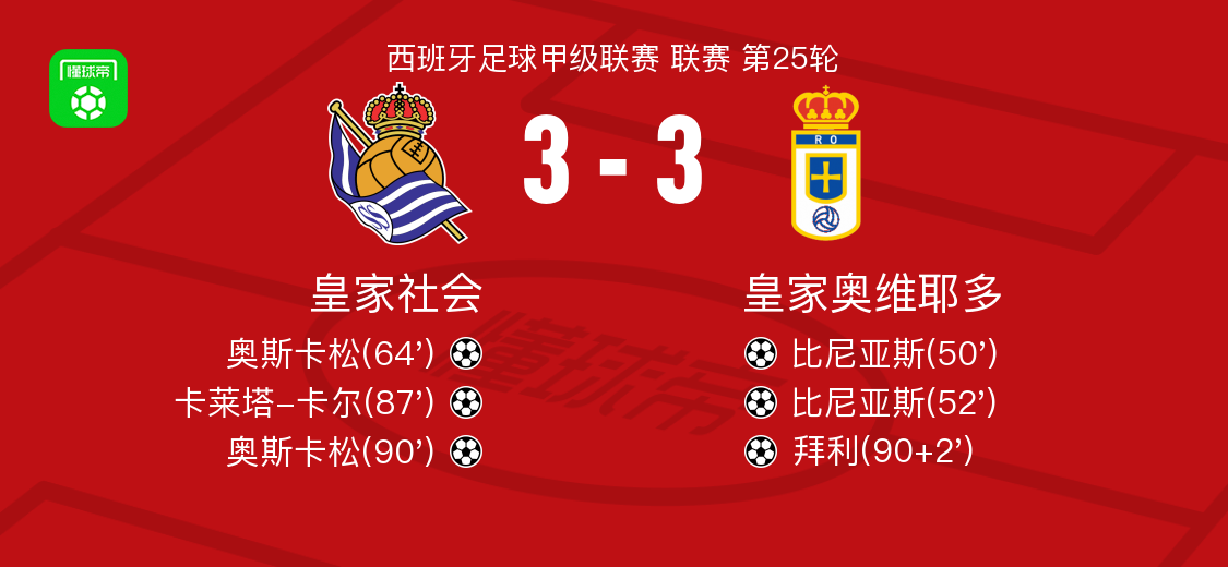 • 皇家社会3-3皇家奥维耶多,比尼亚斯首开记录,拜利救主