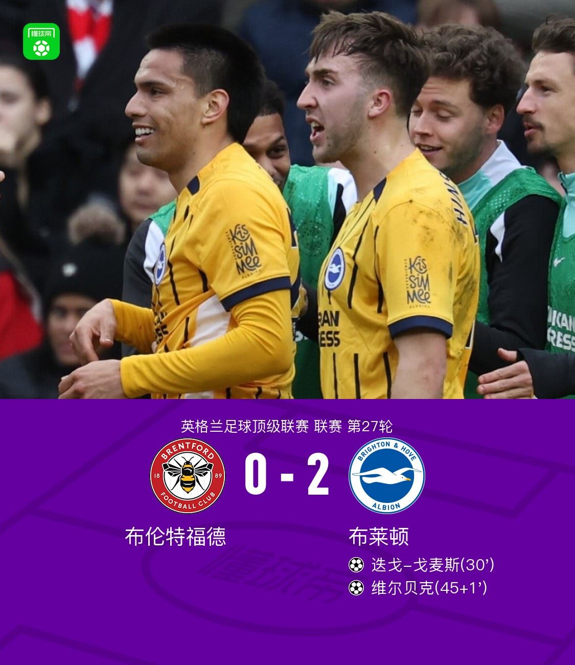 • 布伦特福德0-2布莱顿,迭戈-戈麦斯、维尔贝克建功