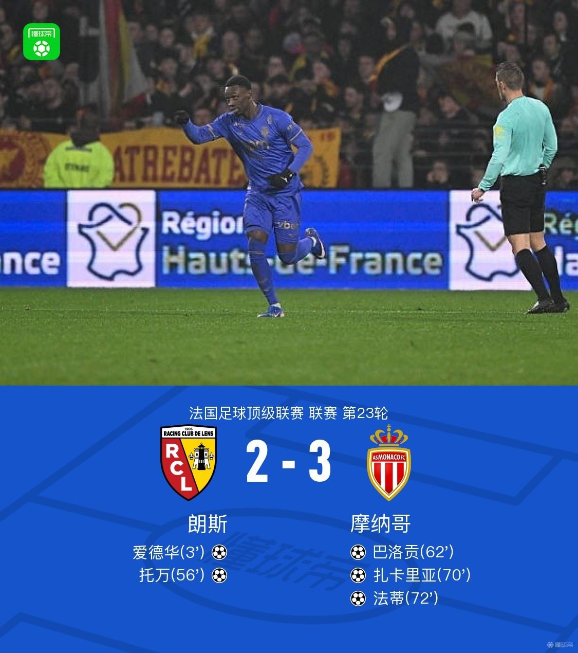 • 朗斯2-3摩纳哥遭逆转,巴洛贡、扎卡里亚进球,法蒂破门反超