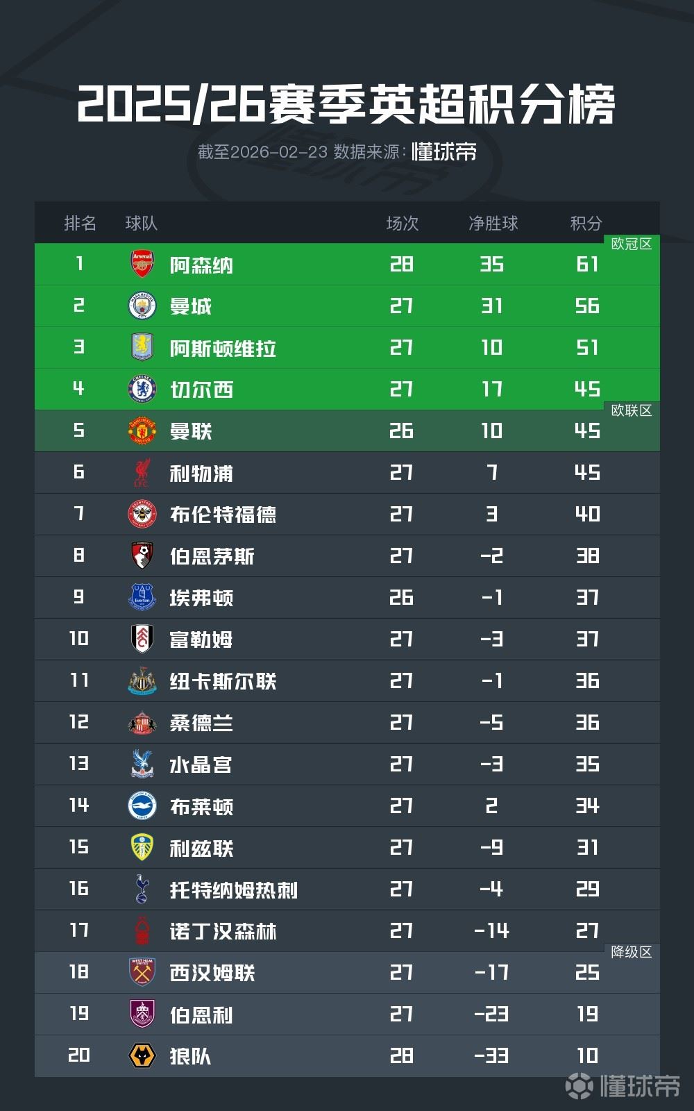 • 谁能夺冠?阿森纳曼城未来英超赛程:第33轮迎直接对话